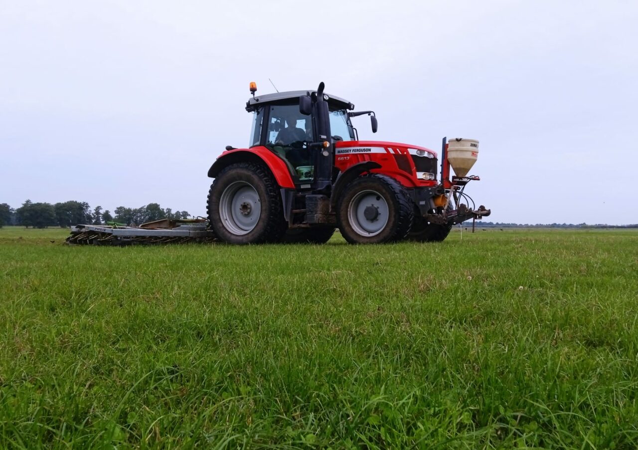 Daarom besloot het echtpaar afgelopen najaar de nieuw aangekochte percelen door te zaaien met klavers. Om openscheuren van de oude grasmat te vermijden, hebben ze een wiedeg gebruikt. Eerst het gras kort maaien, daarna eggen, harken, zaad uitstrooien, nogmaals eggen en met een landrol narollen.